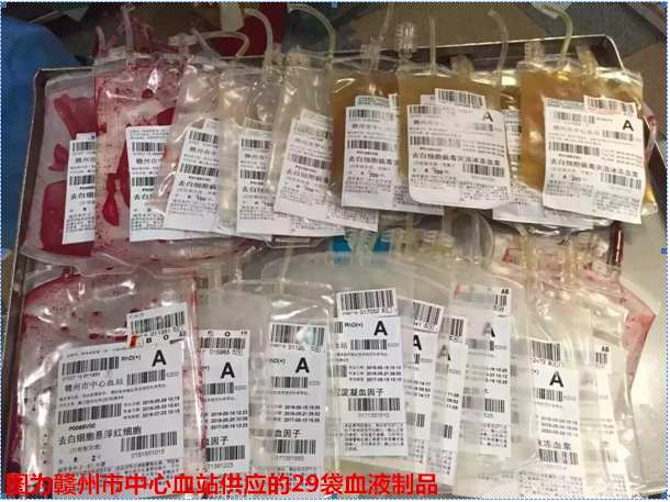 供血科值班人员放下电话后,立即通知送血司机,送血司机迅速到岗,以最快的速度将血液紧急送到医院,保证了该孕妇的手术抢救用血,确保手术的顺利进行。第二天一早值班人员接到医院血库打来的电话告知产妇在抢救过程中输注了不同的血液制品共29袋,因及时供应足够的血液以及医护人员的抢救,产妇已顺利生产,母子平安,我们深感欣慰。电话中我们也了解到该孕妇是独自外出远行,在火车站因突然大出血,被紧急送往赣州市人民医院抢救。