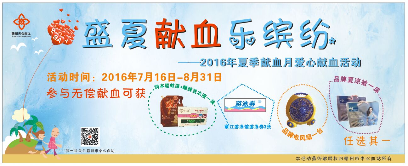 2016年赣州市夏季献血月爱心献血活动开始啦!7月16日-8月31日期间参与无偿献血可获“夏季润本驱蚊组合”一组、亲子游泳体验劵3张(章江游泳馆)、品牌电风扇一台、品牌夏凉被一个等多种纪念品任选其一。(游泳体验券仅限赣州市中心城区)