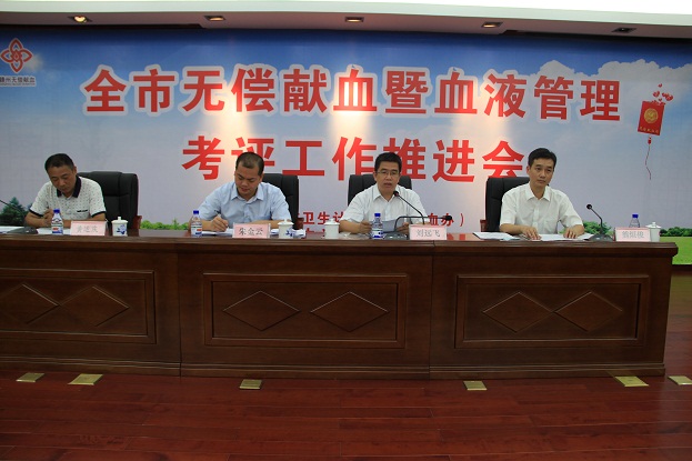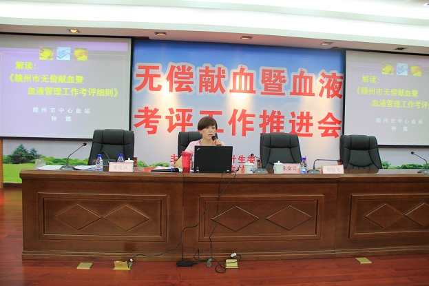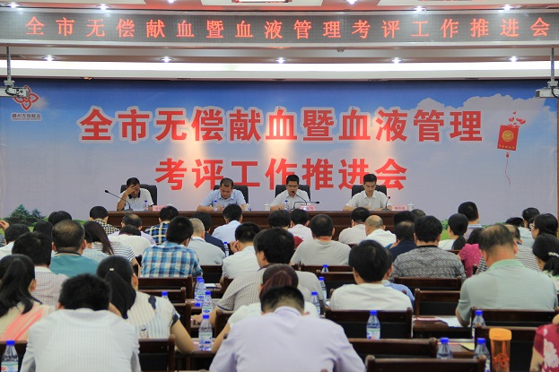 为持续、稳步推进我市无偿献血工作,加强血液管理,根据市卫生计生委于2016年6月下发的赣市卫计医字[2016]86号《赣州市无偿献血暨血液管理考评细则(2016版)的通知》,为切实做好考评工作,赣州市无偿献血暨血液管理工作考评推进会在血站十五楼会议室召开。来自各县(市、区)卫生计生委分管领导、各县(市、区)用血单位分管临床用血的院长共计一百余人参加了本次会议。赣州市卫生计生委副主任刘远飞、医政医管科科长朱金云、市中心血站站长熊烜俊出席了会议。