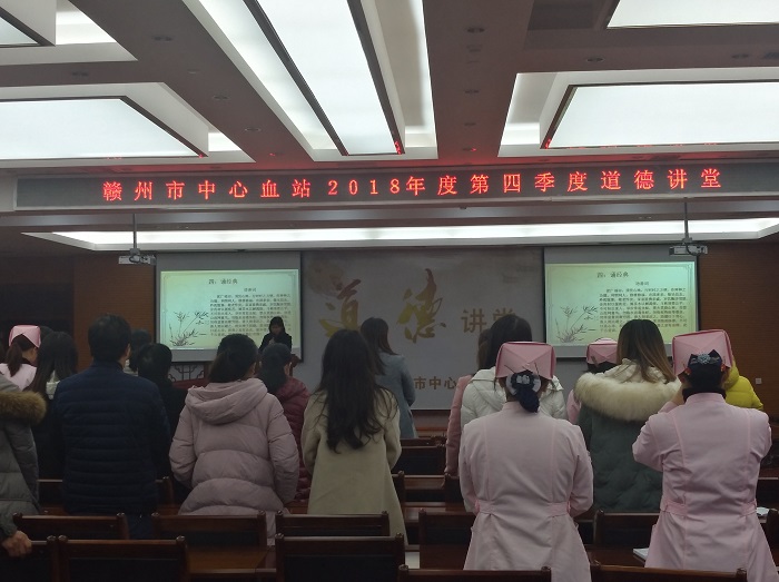 2018年12月28日下午,赣州市中心血站举办了第四季度道德讲堂活动,通过身边看得见、学得到的“平民英雄”和“凡人善举”,宏扬助人为乐、见义勇为、诚实守信、敬业奉献的道德品质,以进一步提升我站献血服务水平与能力,促进无偿献血事业健康持续发展。