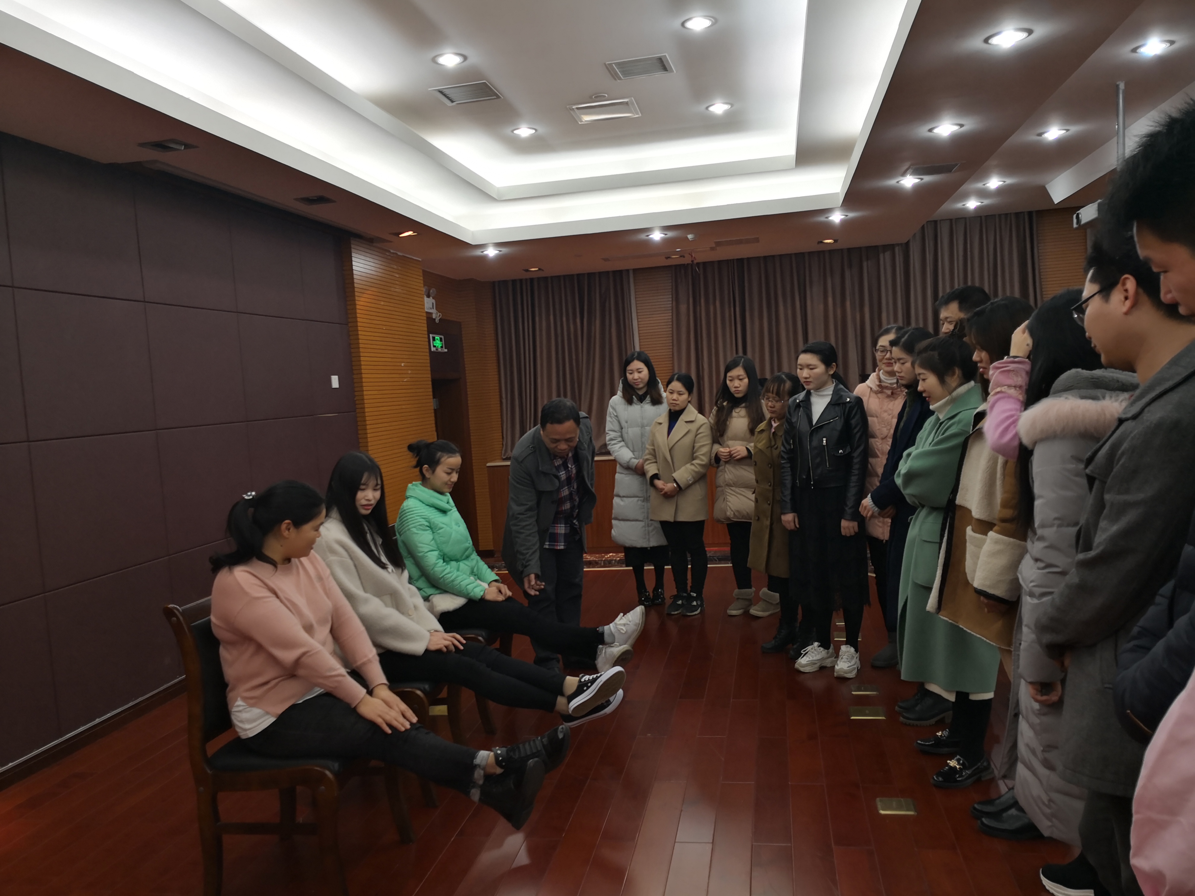 然后,在赖群英赖科长和谢军谢医生现场共同指导下,我科工作人员共同学习肌肉收缩和舒张活动(AMT试验)。
