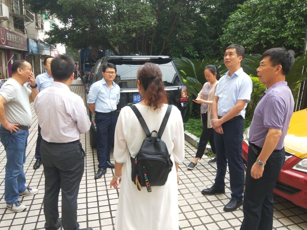 熊烜俊站长与章贡区政府办主任李兴、赣江街道党工委书记任家胤、街道办事处副主任李希鹏查看社区和了解责任路段创卫工作开展情况