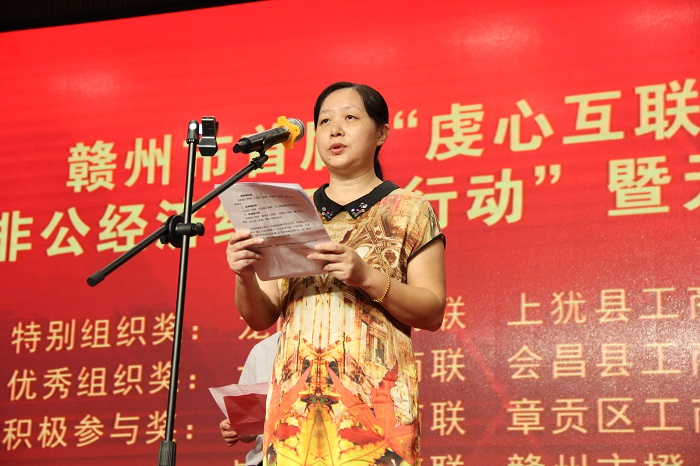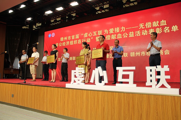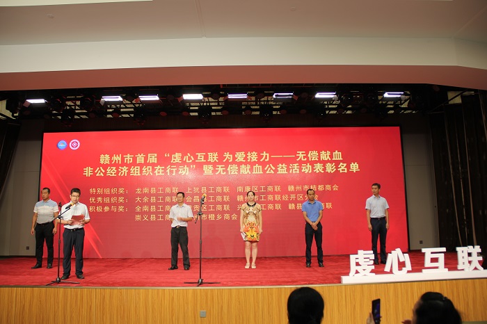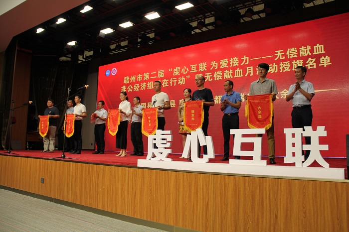 活动表彰了首届“虔心互联 为爱接力”非公经济组织在行动暨无偿献血公益活动中涌现出来的先进个人和先进集体及一批优秀组织奖单位。并向兴国县、信丰县、安远县、宁都县、瑞金市、大余县工商联授旗,该旗帜将由各地带回并在当地开展“虔心互联 为爱接力”非公经济组织在行动无偿献血月活动。