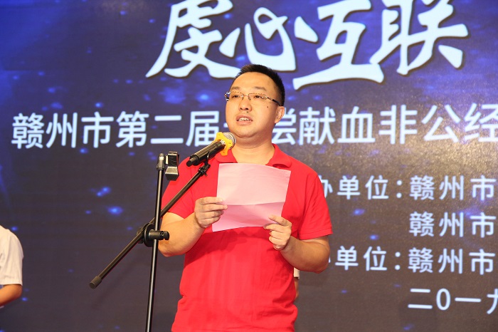 赣州市桔都商会会长林炳煌发言,经开区企业代表江西亚美达科技有限公司罗文财宣读第二届“虔心互联 为爱接力”非公经济无偿献血月活动倡议书