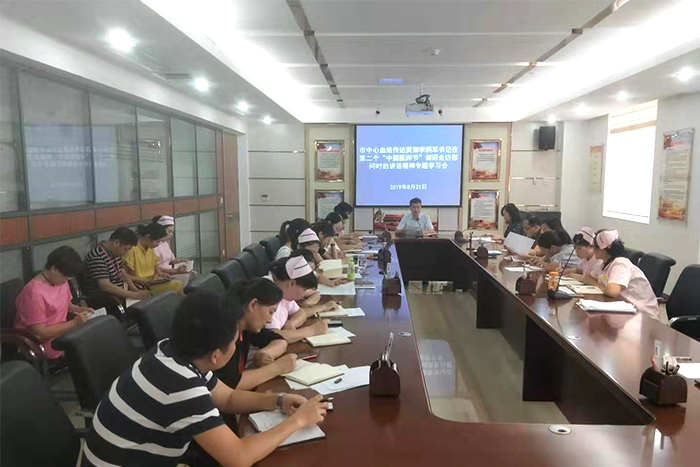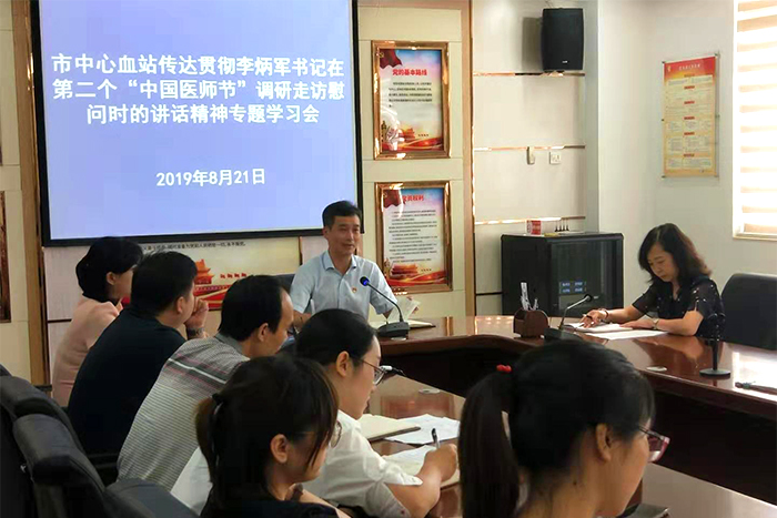 为深入贯彻落实市委五届七次全会精神,传达学习贯彻省委副书记、市委书记李炳军走访慰问一线医师代表和医院建设工作者时的讲话精神,8月21日,市中心血站召开专题学习会,全体党员及中层以上干部参加会议,站党支部书记、站长熊烜俊主持会议并讲话。