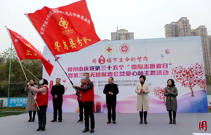 12月5日,赣州市庆祝第三十五个“国际志愿者日”暨第三届无偿献血公益爱心林主题活动在赣州市章江足球主题公园顺利举行。本次活动由赣州市公民无偿献血工作领导小组办公室主办,赣州市红十字会、赣州市园林局、赣州市中心血站承办。市献血办、市卫生健康委、市红十字会、市园林局、市中心血站领导出席活动。各县(市、区)无偿献血志愿工作者、稀有血型献血者、机采献血代表150余人参与活动。