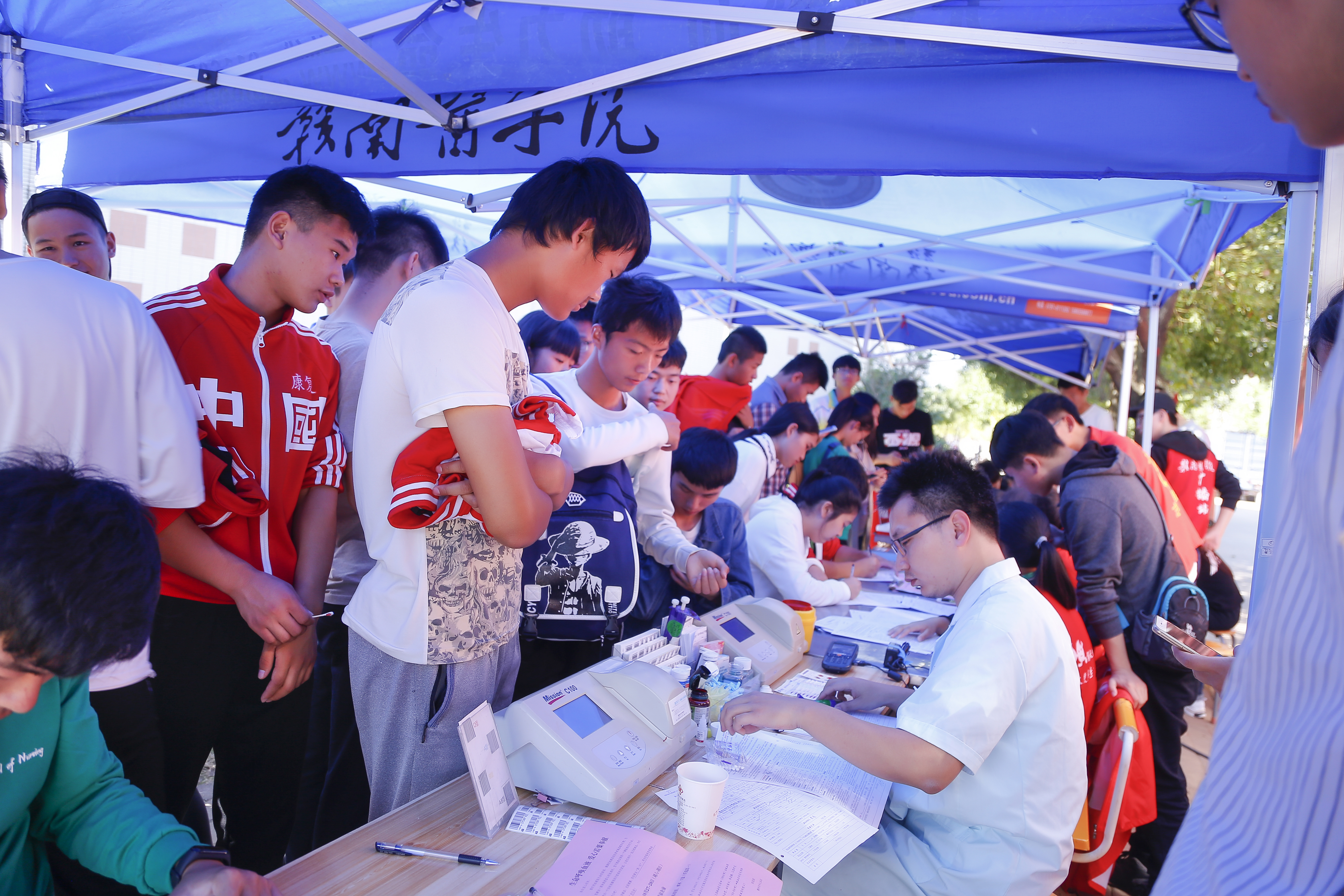 赣州市中心血站献血科体检医生卢迅身穿白色工作服,面对电脑和络绎不绝的献血者,温和而耐心的回答着献血者的疑惑,并为献血者进行献血初步体检和健康征询,此时他的工作服早已被汗水浸透。