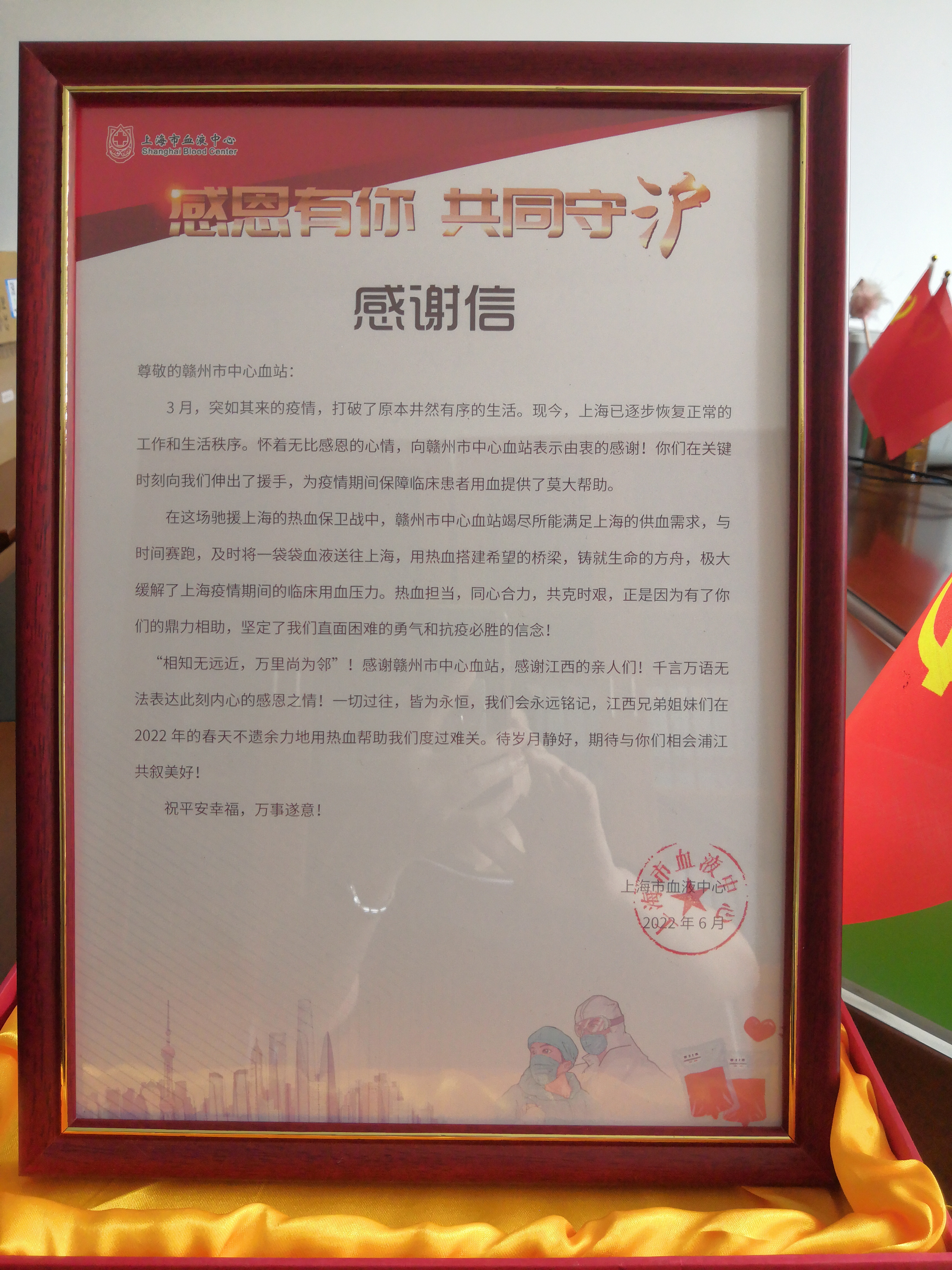 赣州市中心血站收到“感恩有你 共同守沪”感谢信