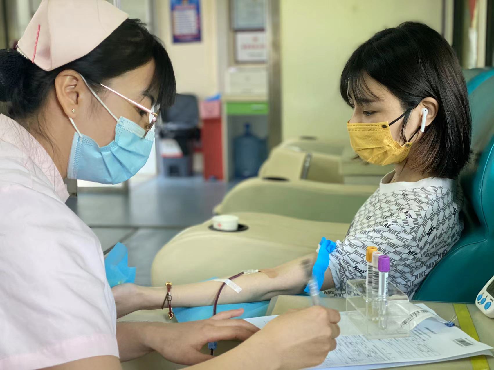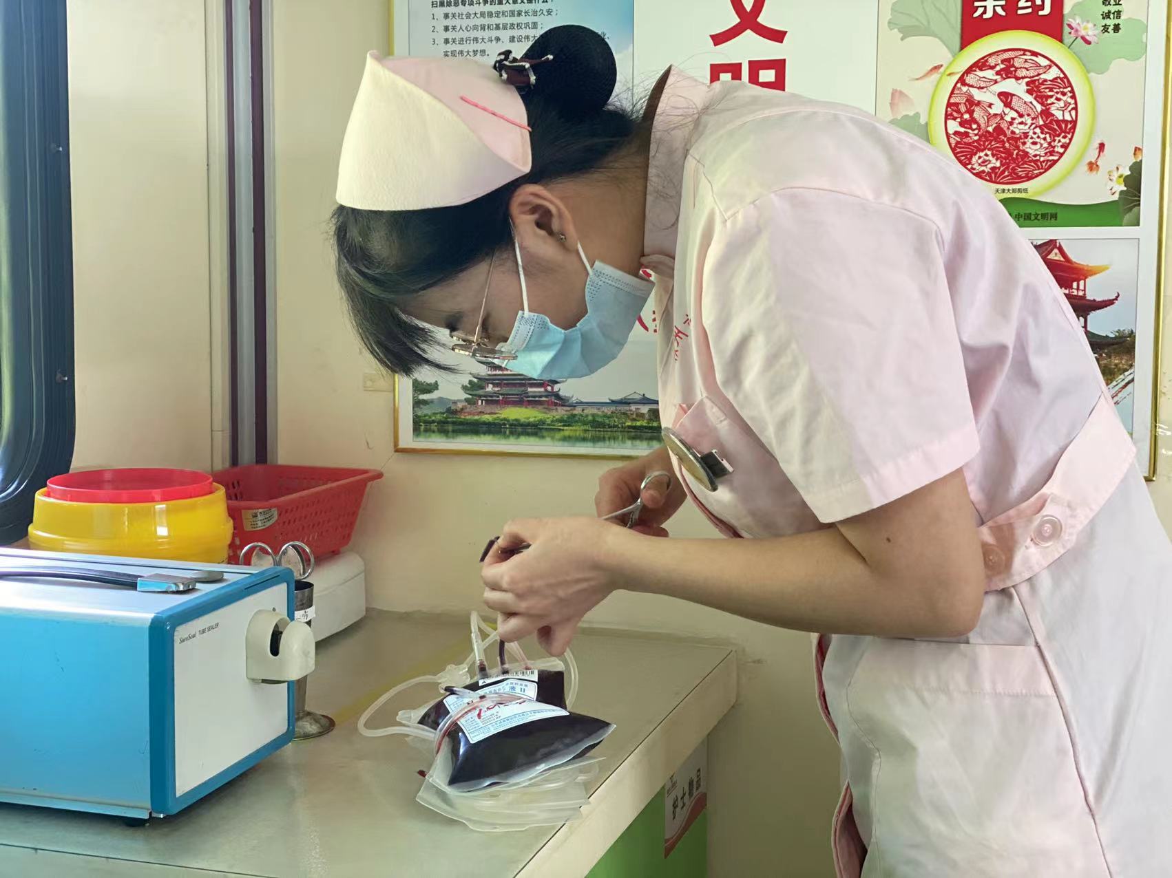 带上无菌手套,给献血者系上橡皮绳,温声叮嘱几句,扎针、出血、收针、止血,这是护士吴瑶瑶当日第30次采集血液。一套采血流程下来不过五六分钟,但为了减少其他献血者的等待时间,吴瑶瑶和其他采血护士经常水喝不上几口,午餐到两三点才草草吃几口冷菜冷饭就立即返回工作岗位。