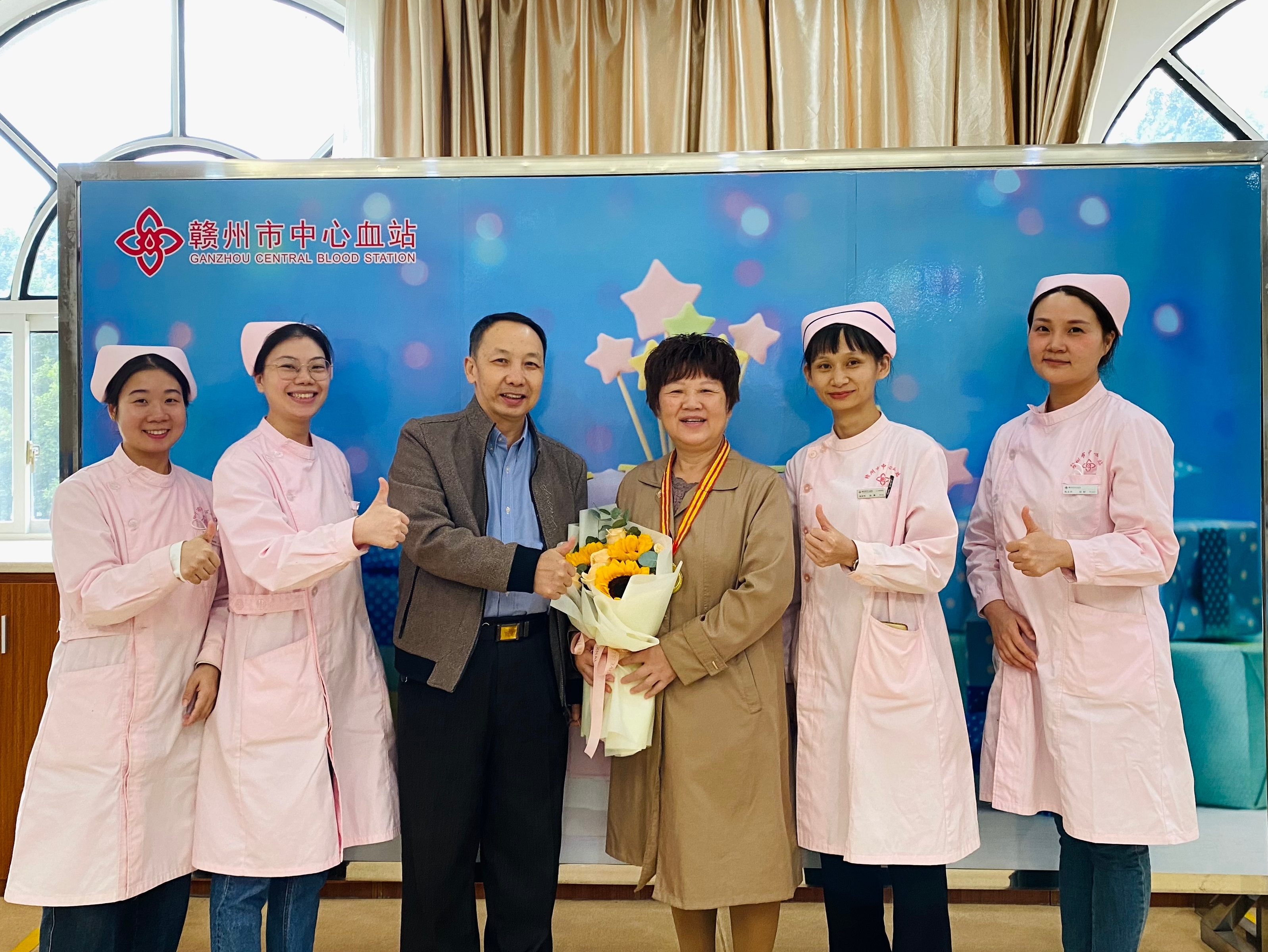 登记、征询体检、血液初筛这些对于她而言已是特别熟悉的流程了,随着护士将采血针注入她体内,殷红的血液沿着透明的导管奔流而出。看着仪器运转,血液中的血小板被一点点汇集,李大姐眼眶里饱含着不舍。“这是我最后一次献血,真的有些舍不得。”她感慨道。机采科科长及当班的医护人员向大姐送上了鲜花,表达了生日的祝福及感谢,并为她颁发了“无偿献血达人奖牌”。