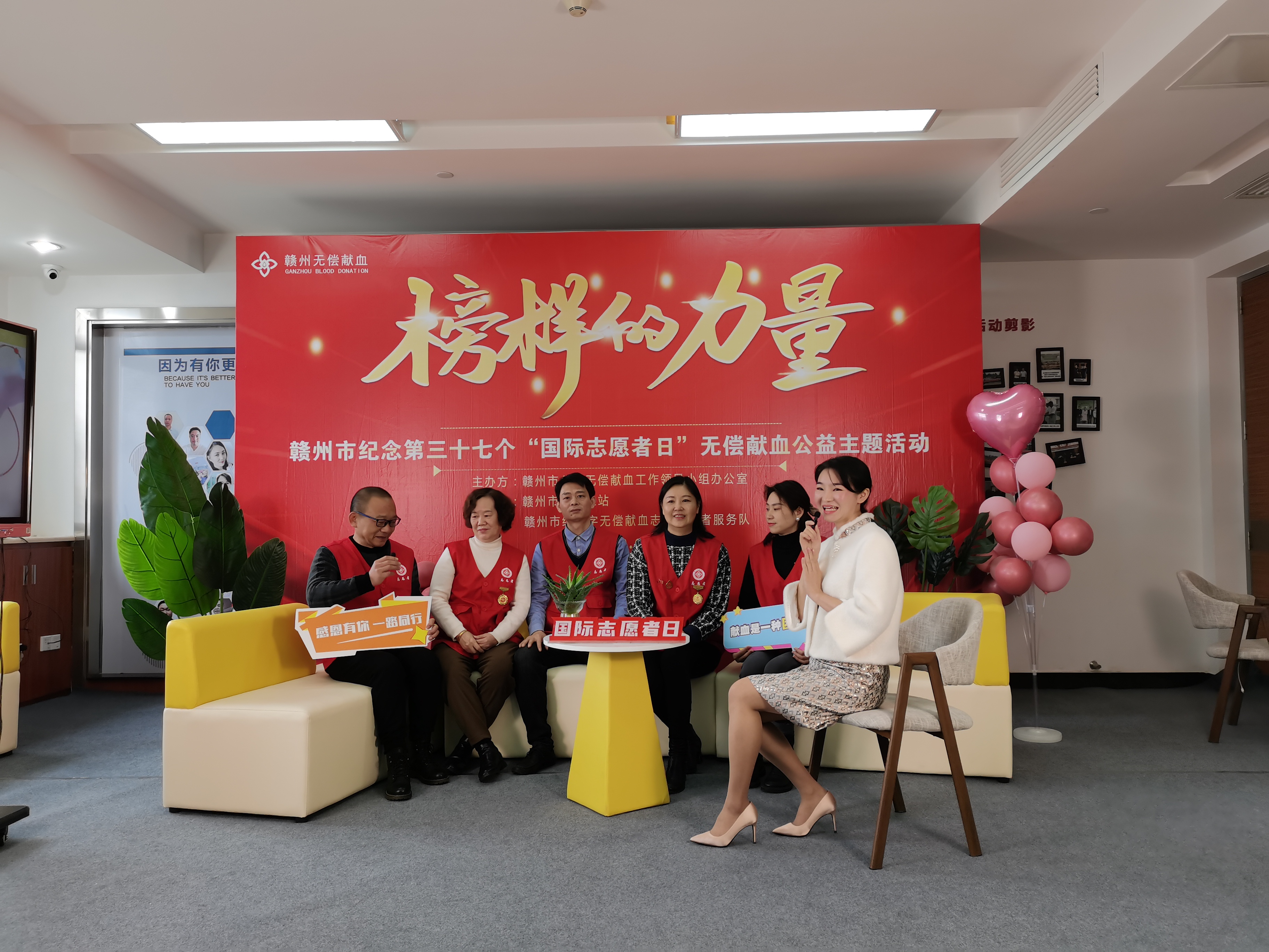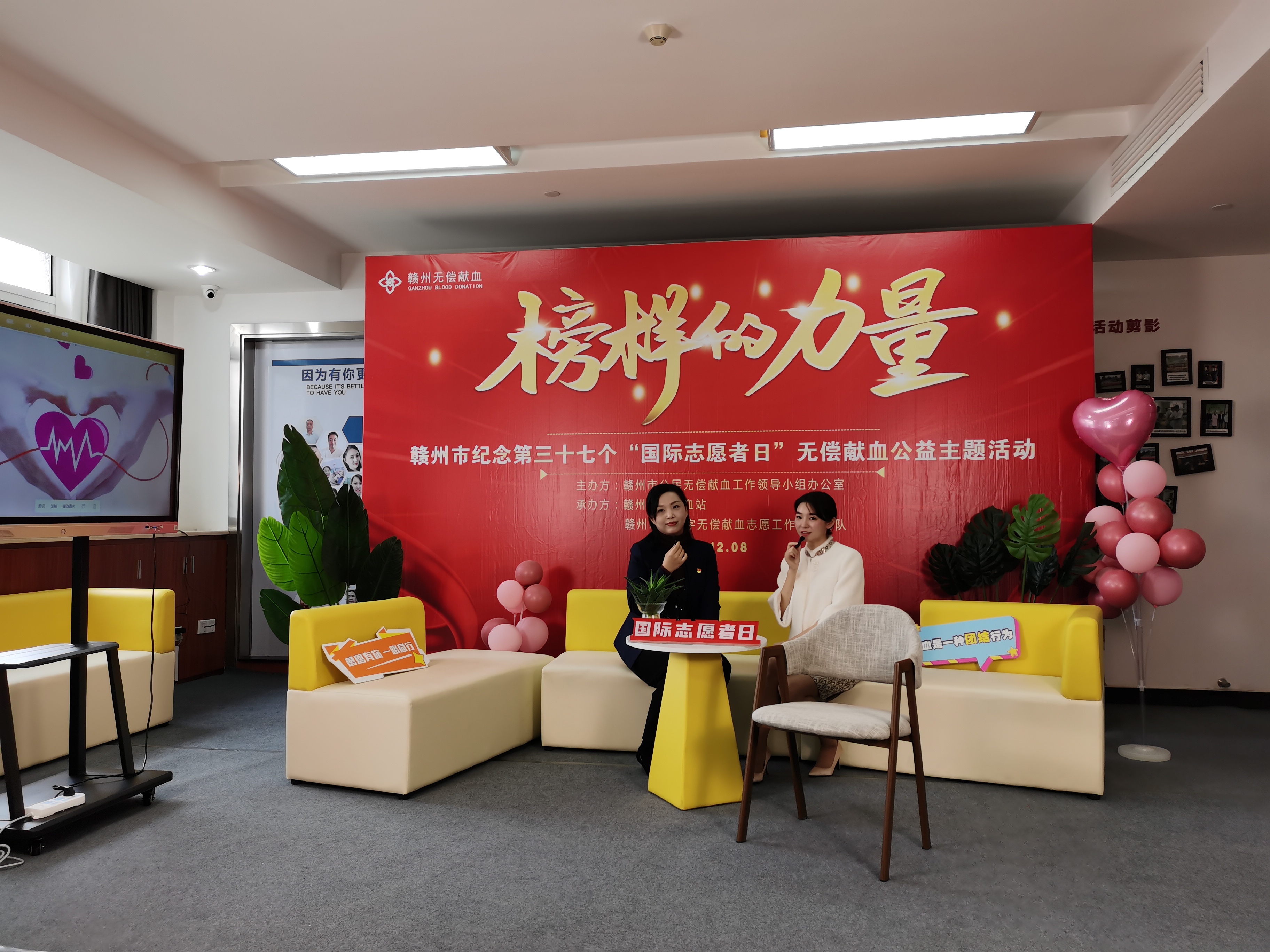 12月8日,赣州市纪念第三十七个“国际志愿者日”无偿献血公益主题直播活动——榜样的力量,在赣州市中心血站举行。此次活动由赣州市献血办主办,赣州市中心血站、赣州市红十字无偿献血志愿工作者服务队承办。来自全国各地的无偿献血服务队队员等参加了此次直播活动。