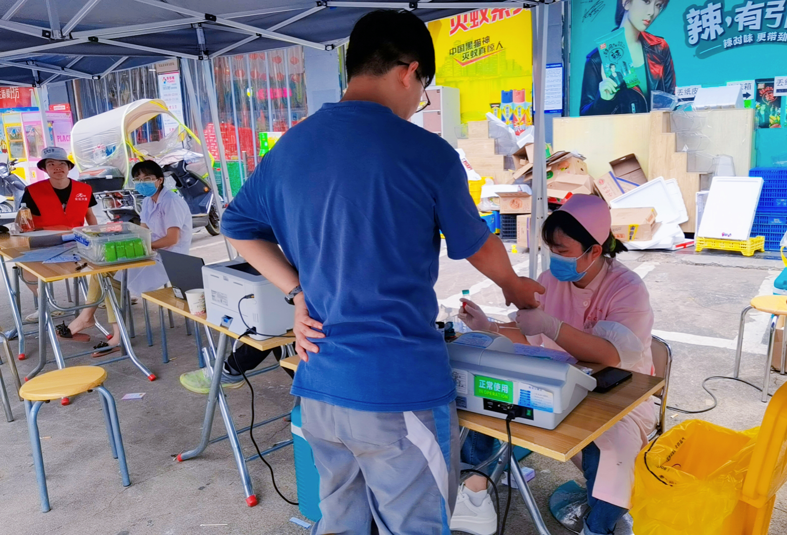 因夏季高温天气影响,街头献血人数大大减少。为确保临床医疗救治用血,我站进一步将无偿献血向街头、团体、乡镇延伸。采血一线工作人员每天迎着第一缕阳光出发,奔赴各社区、乡镇、街头采血。夜晚万家灯火时,他们主动延长工作时间,为献血者提供优质的献血服务,诠释着对职业的忠诚。献血招募、献血者信息登记、体检、初筛、采血……无偿献血现场热火朝天,献血科工作人员铆足干劲加油干,尽管酷暑下的高温和闷热使得衣服干了又湿、湿了又干,工作服上甚至凝结了一层白白的盐霜,汗珠也爬满了他们的脸庞,但他们毫不在意,这并没有冲淡他们对无偿献血者的热情和采血使命的执着。从艳阳高照到夜幕低垂,他们总是一忙就是一整天,顾不上喝水,顾不上吃饭,甚至顾不上上厕所。结束一天的工作,手酸脚麻,腰酸背痛!