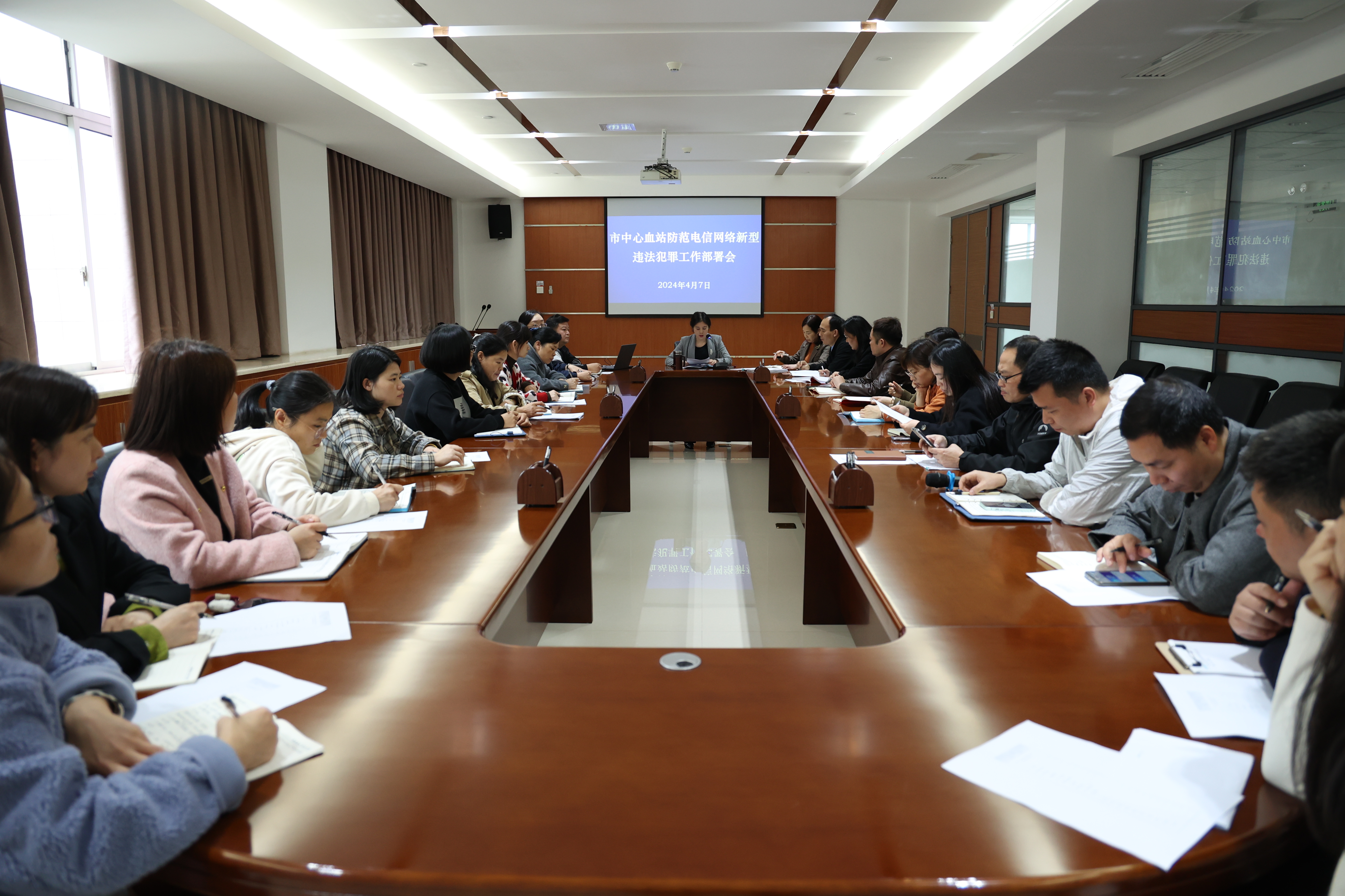4月7日下午,赣州市中心血站召开防范电信网络新型违法犯罪工作调度会,中层以上干部参会。站党支部书记、站长李跃琼主持会议并讲话。