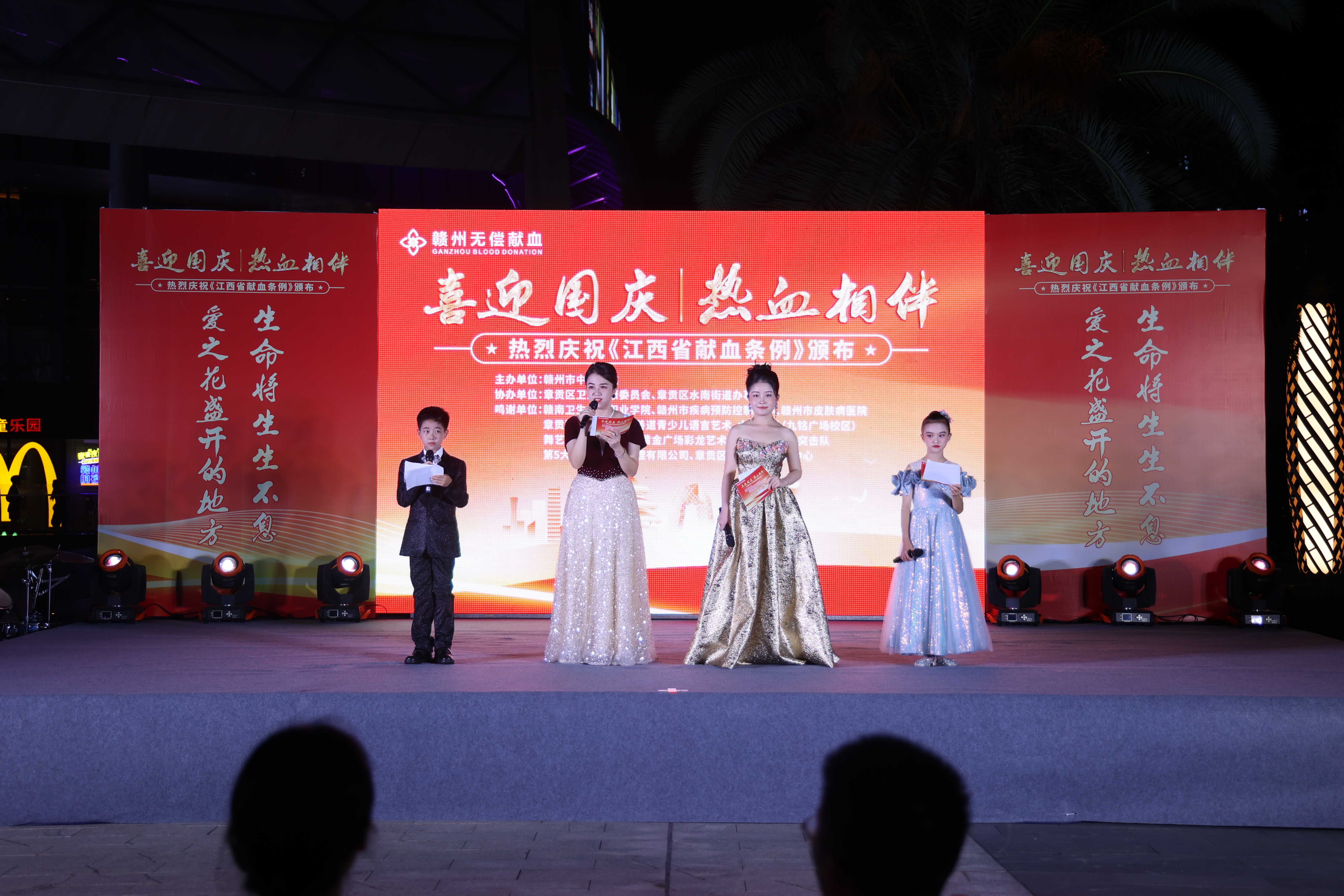 为庆祝中华人民共和国成立75周年,营造欢乐祥和的节日氛围,丰富市民的精神文化生活,9月27日晚,“喜迎国庆 热血相伴”迎国庆暨庆《江西省献血条例》颁布晚会在中心城区第五大道顺利开展,本次活动由市中心血站主办,章贡区卫生健康委员会、章贡区水南街道办事处协办。