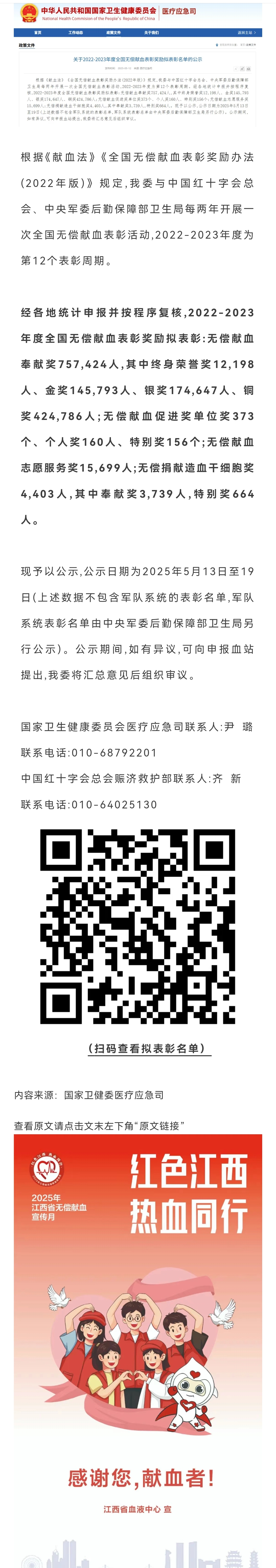 2022-2023年度全国无偿献血表彰奖励拟表彰名单公布