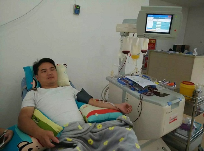 8月3日早上9时许,前来赣州市中心血站献血的献血者络绎不绝,不一会儿就占满了机采室体验大厅。他们当中有教师、公务员、工厂工人、公交车司机、个体户,还有医务人员,王峰就是其中一员。王峰,赣南医学院第一附属医院输血科医生,献血三年,其中献全血1次,机采23次,总计献血小板45个单位。作为医院输血科医生,他非常清楚医院的用血情况,所以,在得知血库告急,特别是“O”型血小板紧张之后,就特地抽空前来血站献血。