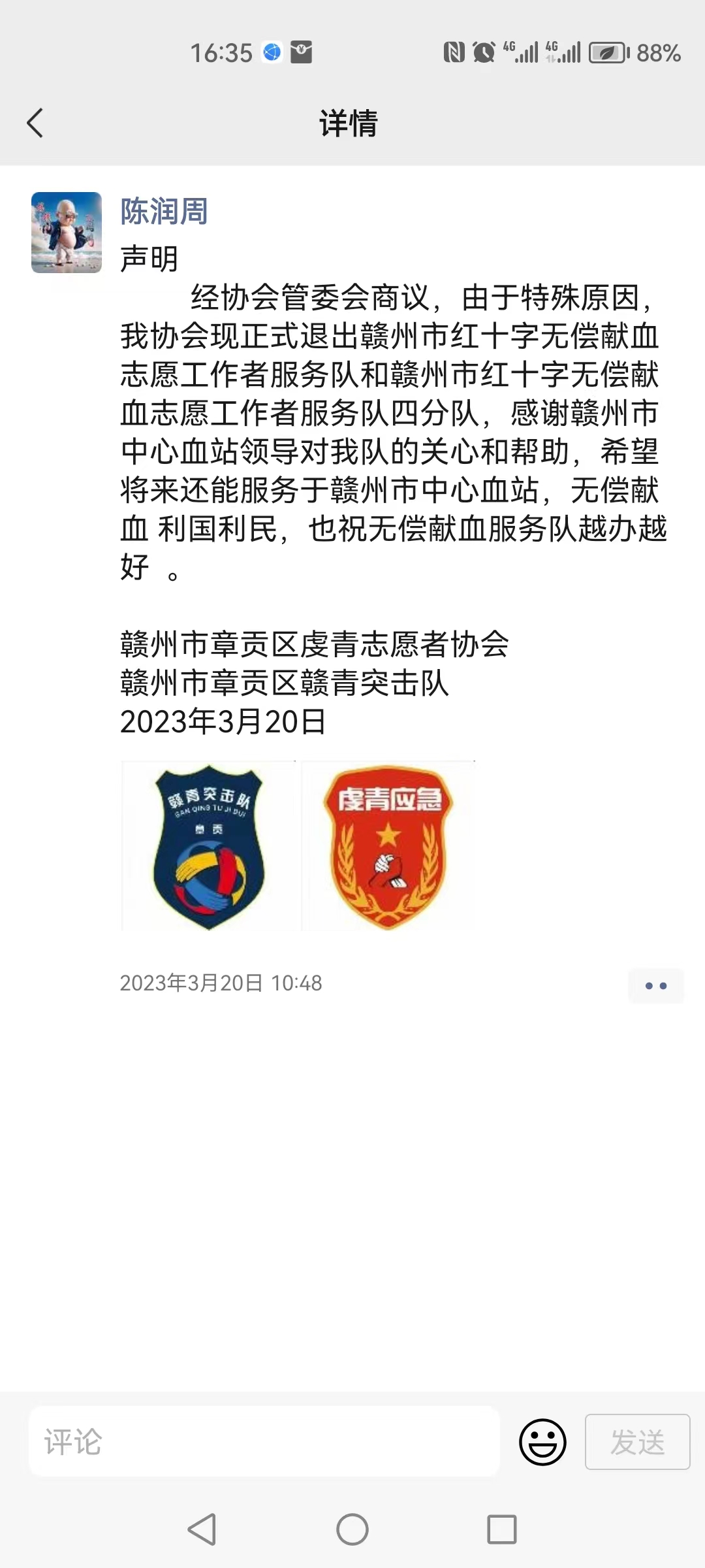 三、即日起,其所参加的各项社会活动与赣州市红十字无偿献血志愿工作者服务队无关。