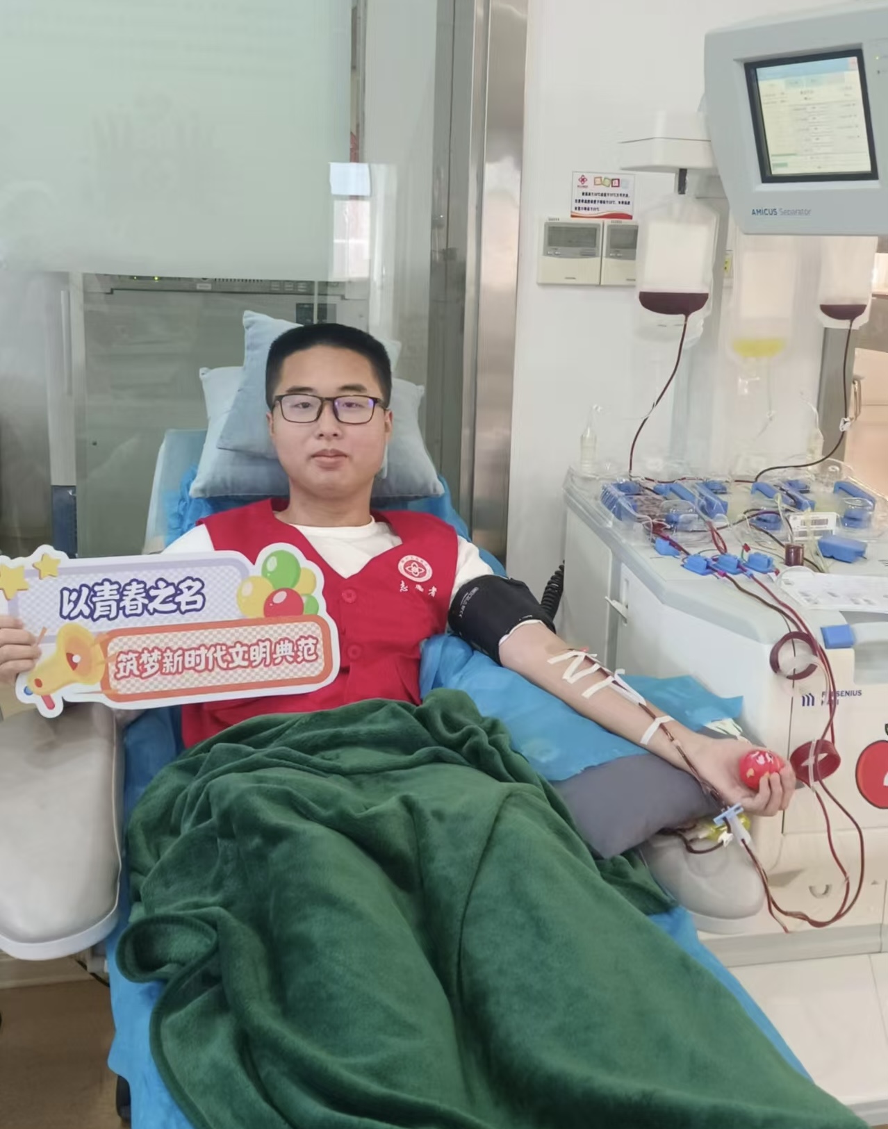他的献血之路始于校园内外的榜样力量。班级辅导员、班导以及专业课老师,他们不仅是知识的传递者,更是无偿献血精神的传播者与践行者。在耳濡目染之下,傅梓航在街头与献血车不期而遇时,没有丝毫犹豫,他便踏上了奉献爱心的旅程。