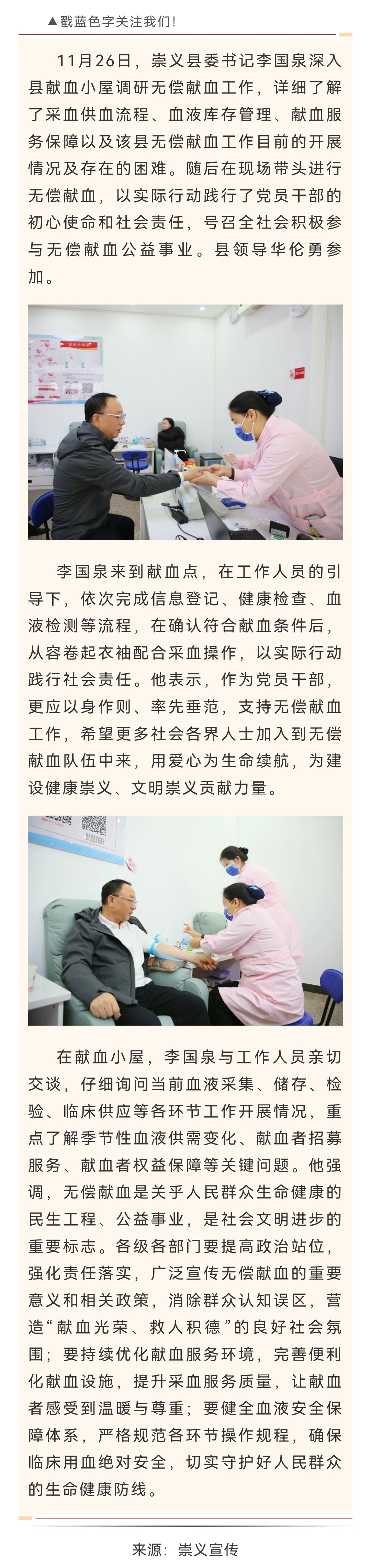崇义县委书记李国泉调研无偿献血工作并带头献血